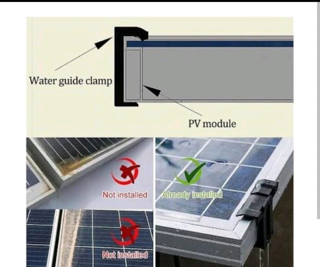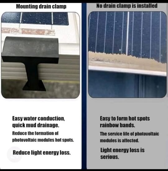 Image 1: Comparison of panels with and without the water drain clamp, highlighting reduced dust accumulation and better drainage.